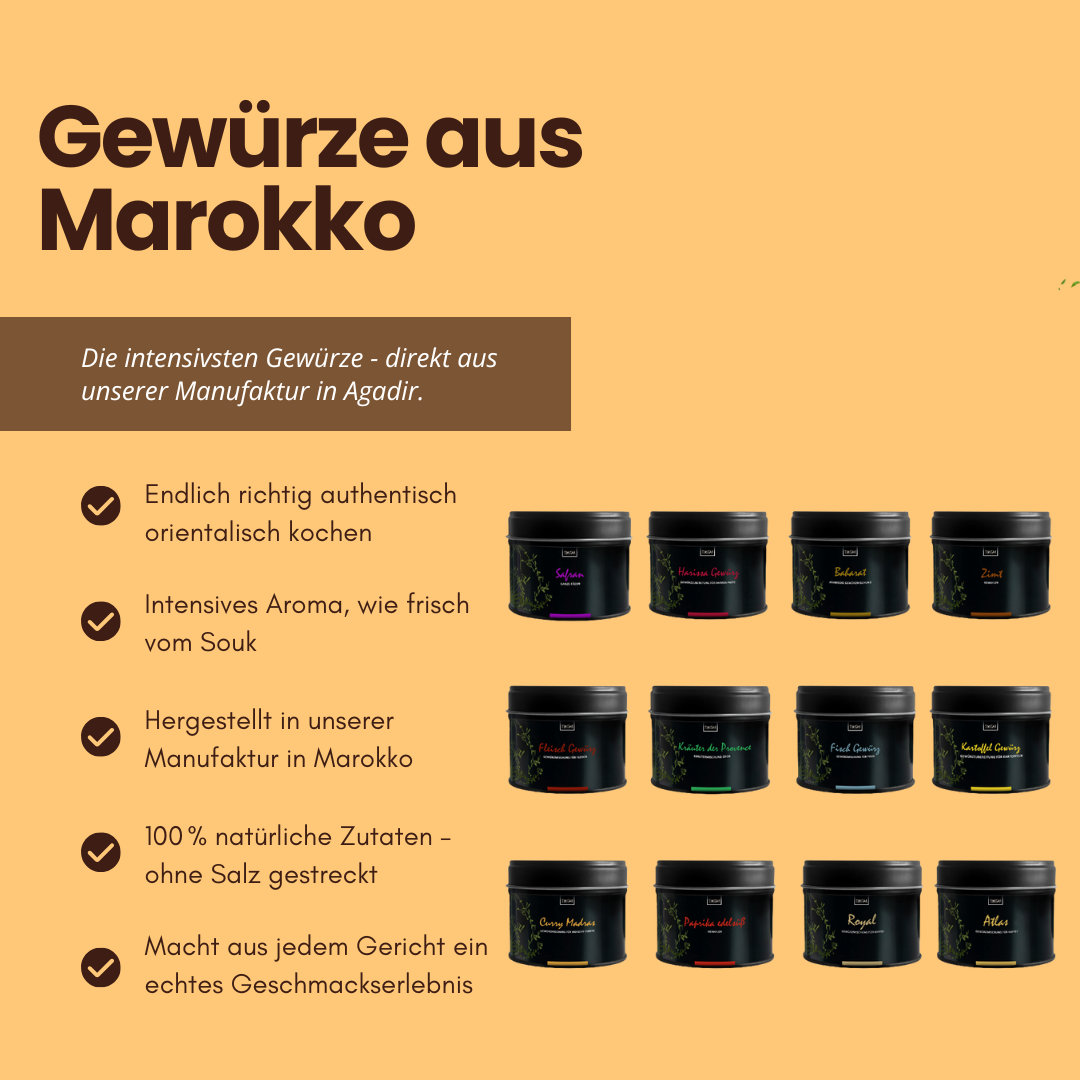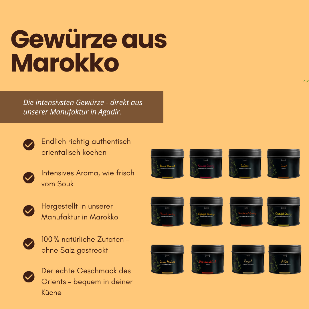 Hergestellt: aus 100% natürlichen Zutaten in unserer Gewürzmanufaktur in Agadir, Marokko